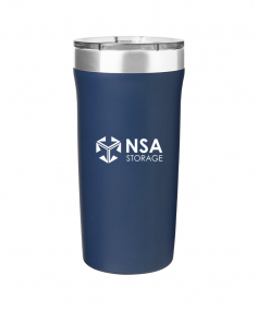 18 oz double wall 18/8 stainless steel thermal tumbler with vacuum insulation, brushed stainless steel rim, clear push-on acrylic lid with sliding closure, and powder coated finish. Hand wash recommended. Do not microwave. Complies with FDA, Prop 65. 7.25" H x 3.5" W
