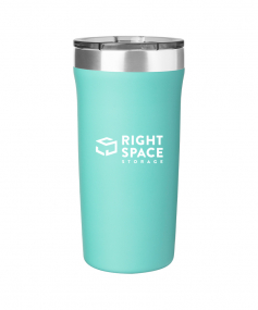 18 oz double wall 18/8 stainless steel thermal tumbler with vacuum insulation, brushed stainless steel rim, clear push-on acrylic lid with sliding closure, and powder coated finish. Hand wash recommended. Do not microwave. Complies with FDA, Prop 65. 7.25" H x 3.5" W
